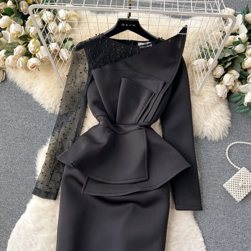 Elegant Black Peplum Midi Dress – Glamour Edition