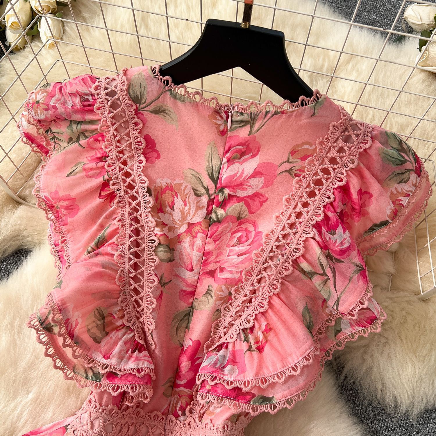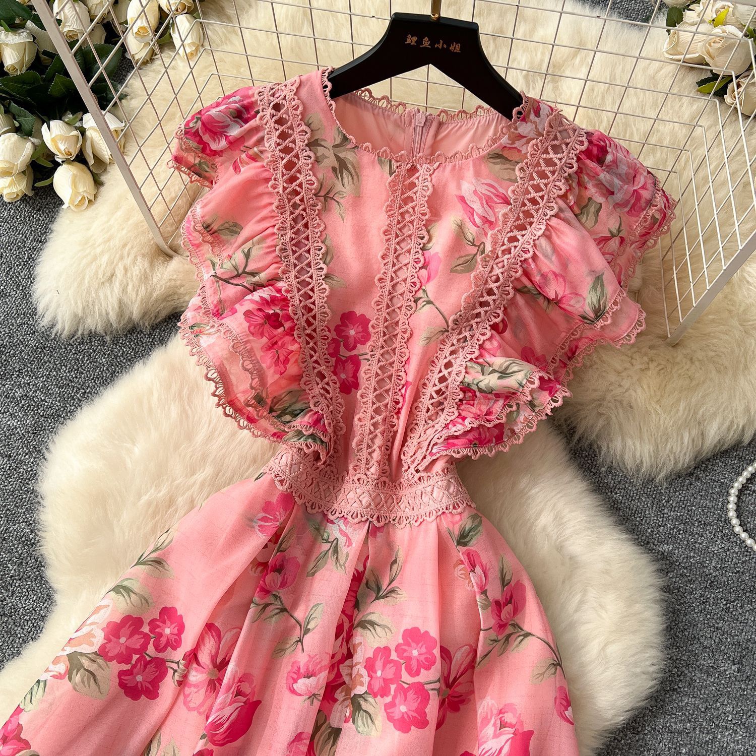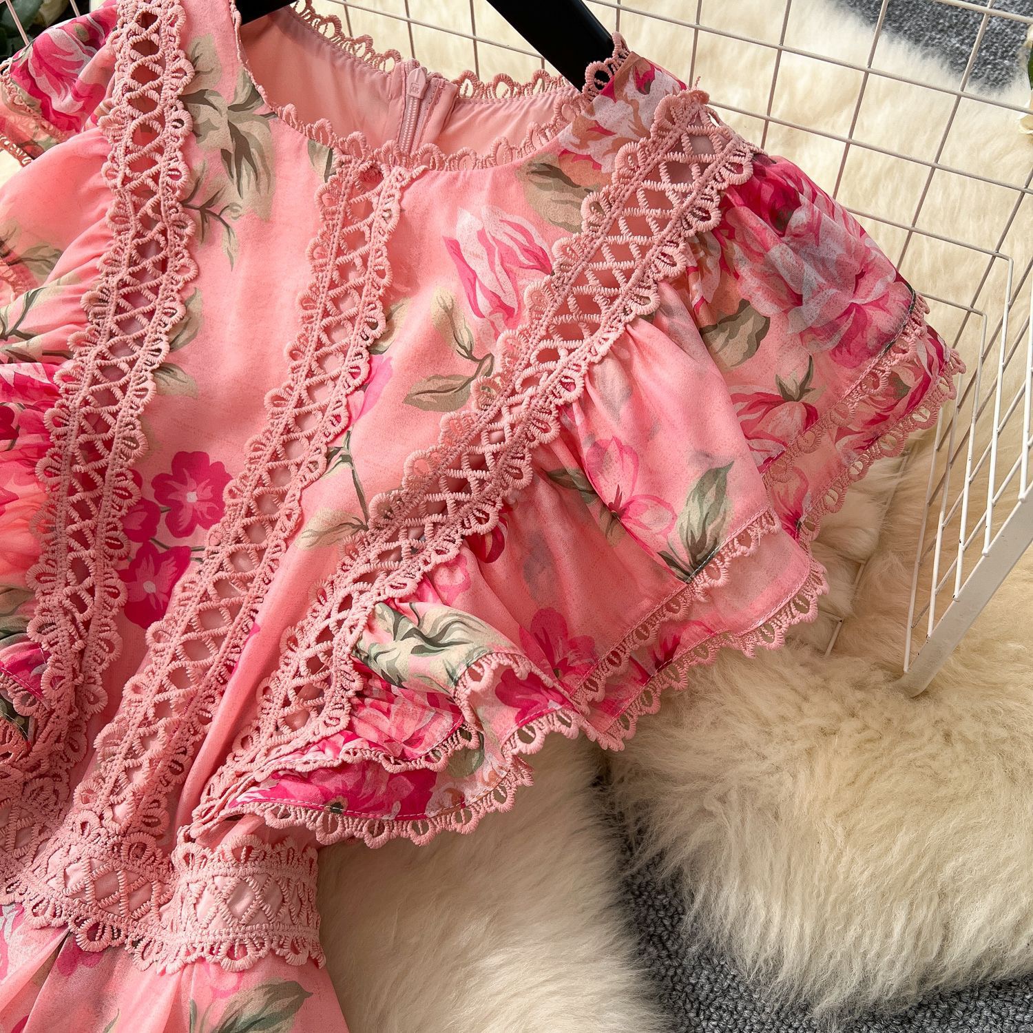 The high neckline, delicate lace trim, and charming ruffle flutter sleeves create a vintage-inspired look, while the flowing A-line maxi skirt and tiered lace-accented hem make it perfect for garden parties, summer weddings, elegant brunches, or chic holidays. Its breathable chiffon ensures comfort and a beautiful, graceful drape.