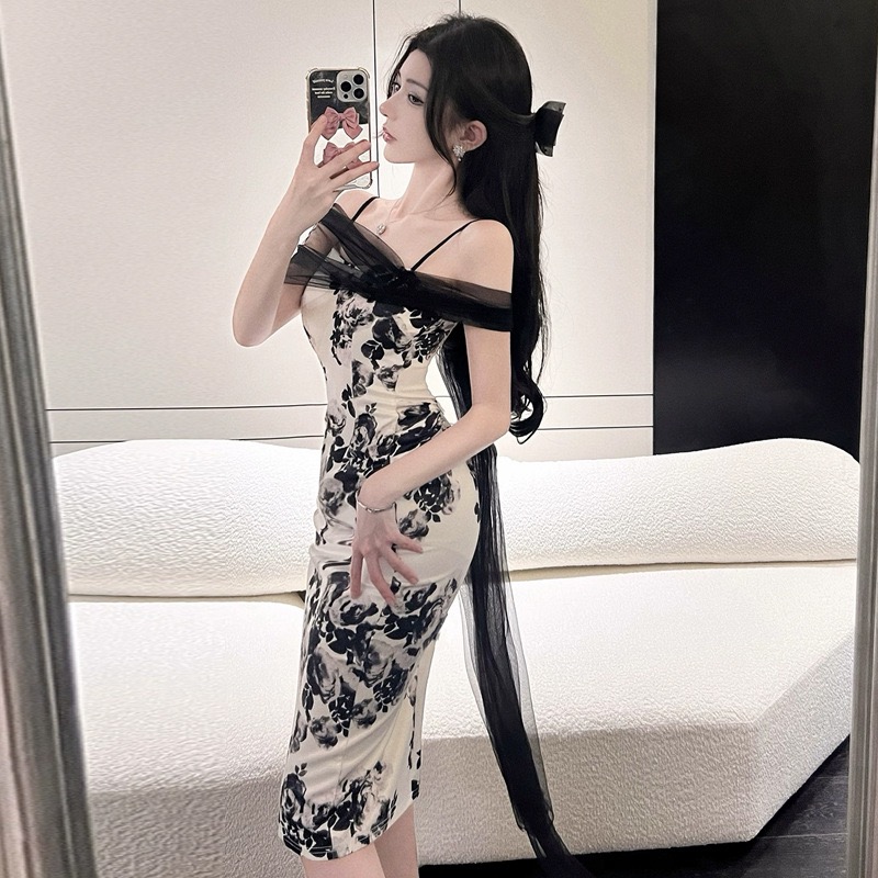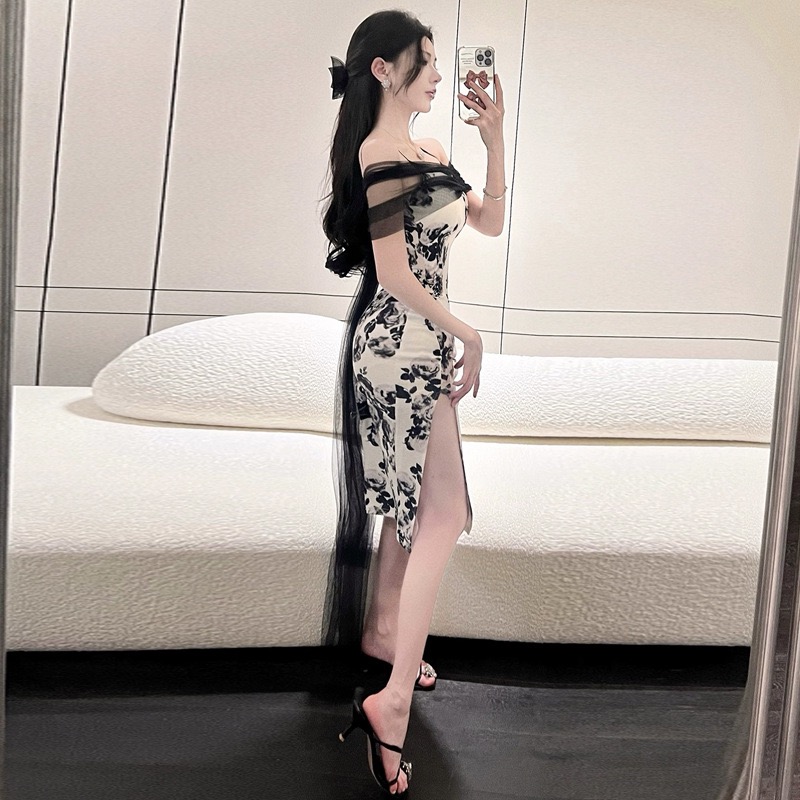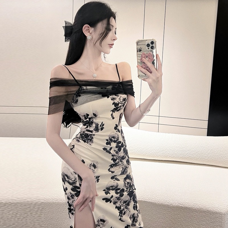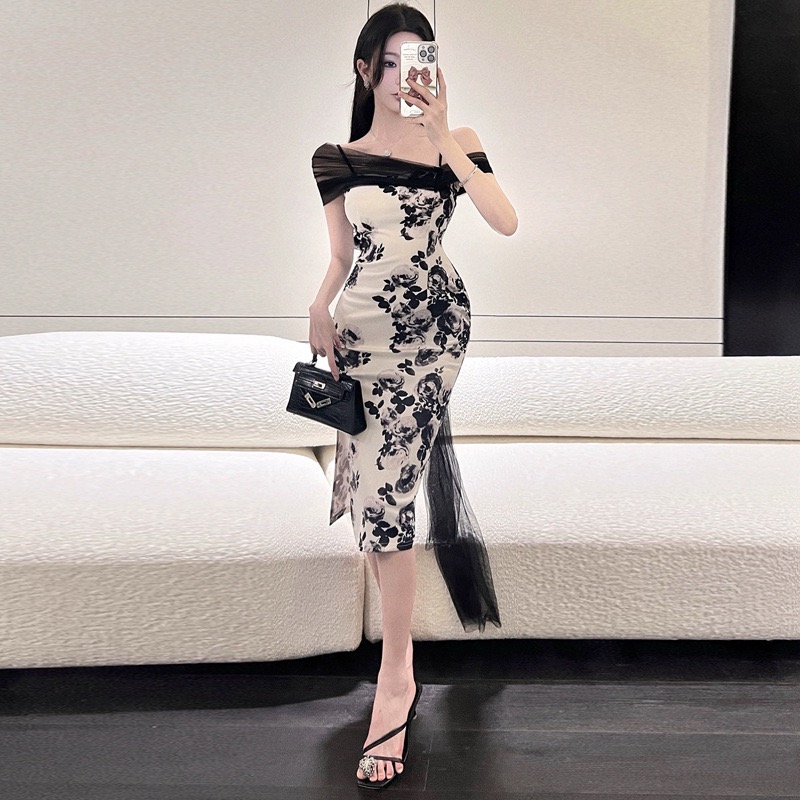 The romantic off-shoulder neckline, crafted from delicate sheer black mesh, adds an alluring yet sophisticated charm. Fitted with subtle spaghetti straps for support, this bodycon dress boasts a chic midi length and a subtle side slit, making it perfect for cocktail parties, dinner dates, romantic evenings, or any event where you want to radiate vintage-inspired glamour. Its comfortable fit ensures you look and feel sensational all night long.